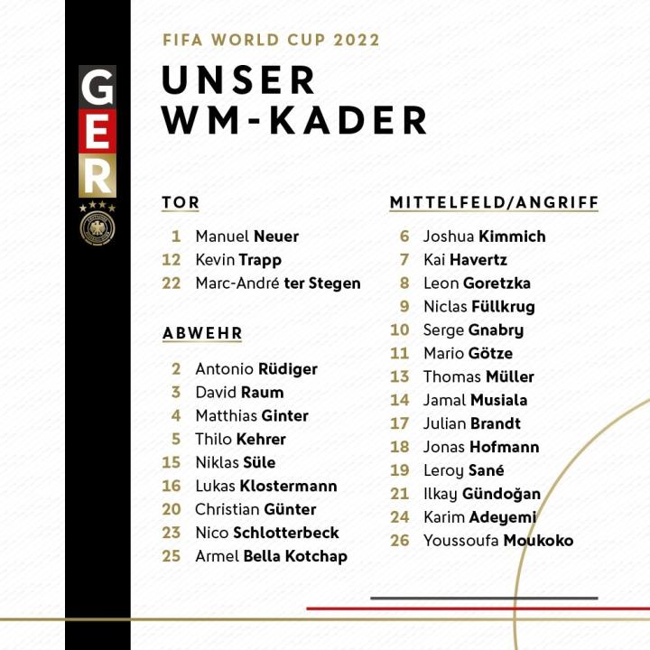 中场:6-基米希(拜仁慕尼黑)、14-穆西亚拉(拜仁慕尼黑)、8-格雷茨卡(拜仁慕尼黑)、21-京多安(曼城)、17-布兰特(多特蒙德)、11-格策(法兰克福)