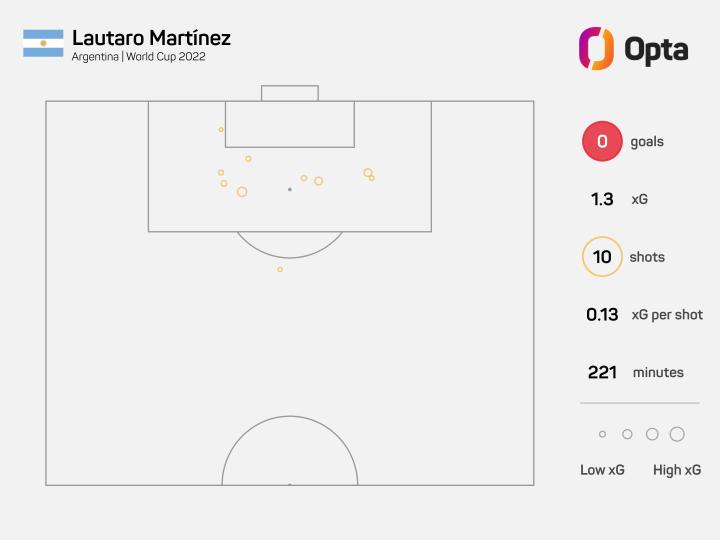 本届世界杯至今,劳塔罗出场5次,2次首发,累计出场时间221分钟,完成10次射门,预期进球1.3,但一球未进。
