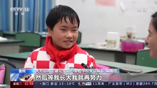 大方县对江镇元宝同心实验学校女足队长 吴雨洁:足球我从小时候踢到现在,我感觉它已经成了我的一个朋友,这段时间不踢感觉有点别扭,就是感觉生活中缺少了一部分东西一样。我想等我病好了,我要加倍把我落下的这些没训练的东西全部练上来,然后等我长大我就再努力,就去踢世界杯。
