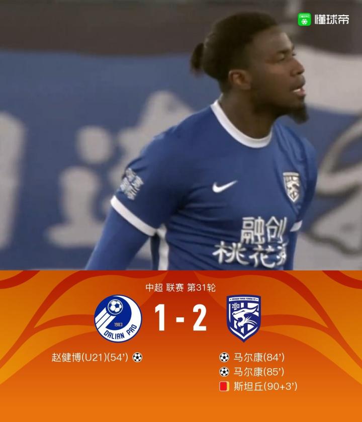北京时间12月14日15:00,中超第31轮展开争夺,大连人坐镇主场大连体育中心体育场迎战武汉三镇,本场主裁判为黄翼,VAR裁判为刘钊。上半场,库迪热提屡救险,埃德米尔森伤退。下半场,赵健博撞射破门斩获职业生涯首球后头槌再下一城因越位在先被判无效,戴维森失单刀;马尔康尾声阶段一分钟内力挽狂澜头顶脚踢连入两球扭转乾坤,斯坦丘补时阶段累计两黄被罚下。最终,大连主场1-2遭三镇逆转,四连胜终结。