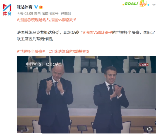据@咪咕体育,法国总统马克龙抵达多哈,现场观战了法国VS摩洛哥的世界杯半决赛,国际足联主席因凡蒂诺作陪。
