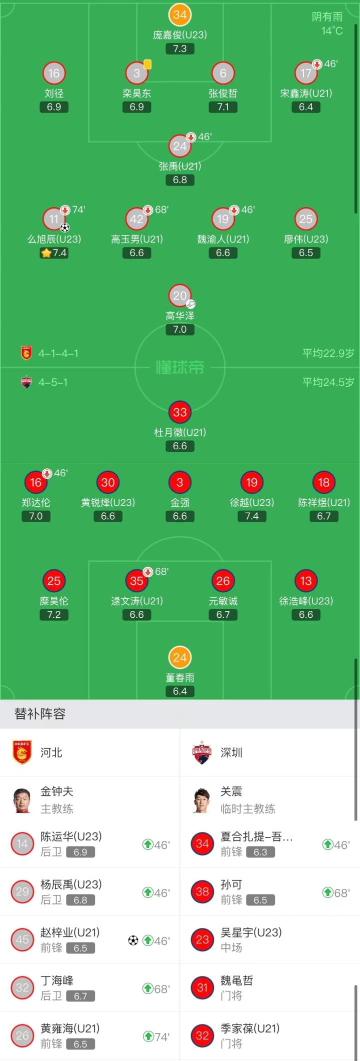 河北首发:34-庞嘉俊(U23)、3-栾昊东、6-张俊哲、16-刘径、17-宋鑫涛(U23)(46'29-杨辰禹(U23))、19-魏渝人(U23)(46'45-赵梓业(U23))、20-高华泽、24-张禹(U23)(46'14-陈运华(U23))、25-廖伟(U23)、42-高玉男(U23)(68'32-丁海峰)、11-么旭辰(U23)(74'26-黄雍海(U23))