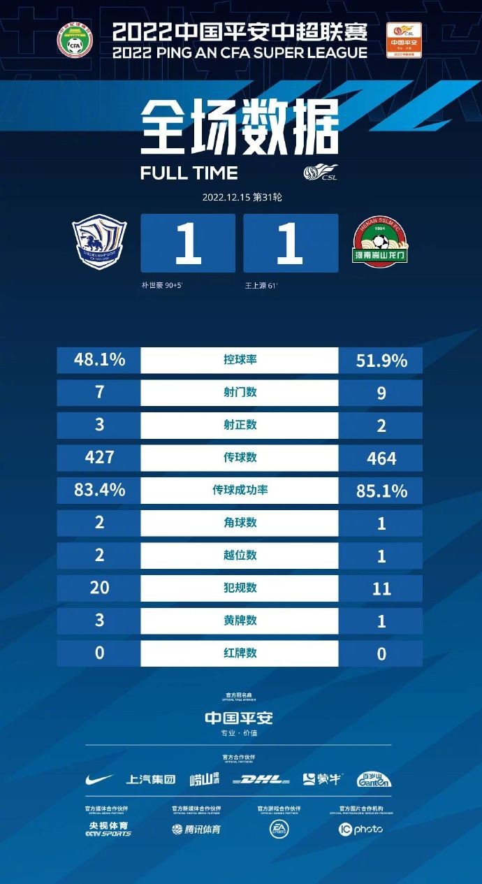 中超第31轮,沧州雄狮1-1战平河南嵩山龙门,双方控球率为48.1-51.9%,河南稍占上风,射门数7-9,河南占优,射正数双方为3-2,沧州占优。