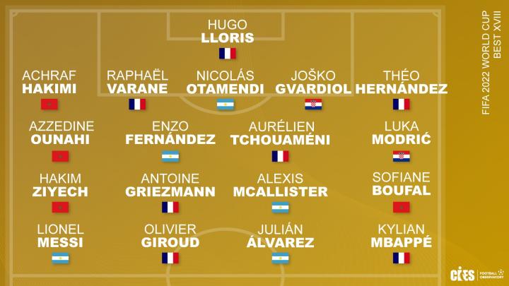 前场:齐耶赫(摩洛哥),格列兹曼(法国),麦卡利斯特(阿根廷),鲍法尔(摩洛哥),梅西(阿根廷),吉鲁(法国),阿尔瓦雷斯(阿根廷),姆巴佩(法国)