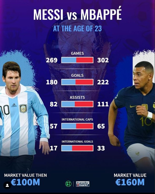 法国即将和阿根廷争夺本届世界杯的冠军,赛前德国知名足球数据网站“转会市场”对比了两队头号球星姆巴佩和梅西的数据。“转会市场”列出了姆巴佩与23岁梅西的同期数据对比,姆巴佩在302场比赛中攻入222球,而23岁时梅西在269场比赛中攻入180球。