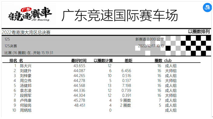 中国体育报讯 12月16日至17日,2022年粤港澳大湾区赛车节•卡丁车总决赛在广东竞速国际赛车场落幕。寒冷天气下,参赛车手热情高涨,最终由陈大兴和刘建升分别夺得125cc大师组和125cc成人组冠军,熊可强则登上超级四冲1小时耐力赛的最高颁奖台。