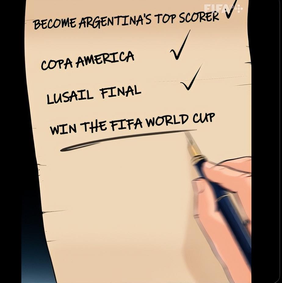 这则视频开头,身着阿根廷10号球衣的梅西缓缓走来,随后拿起一卷长长的、名为“职业生涯成就”的记录文本,第一项是“为纽维尔老男孩(俱乐部)效力”、他在后方打了个勾。随后镜头划过数不清的“职业生涯成就”,最终来到长卷末尾,视频主人公梅西在“成为阿根廷顶级球员”“美洲杯”“卢塞尔决赛”三项成就后打了勾,最后一项“赢得世界杯冠军”则未完待续…… 世界杯官方推特在这则视频上方的配文写道:“梅西会在他的职业生涯成就清单上再添一笔吗?”↓