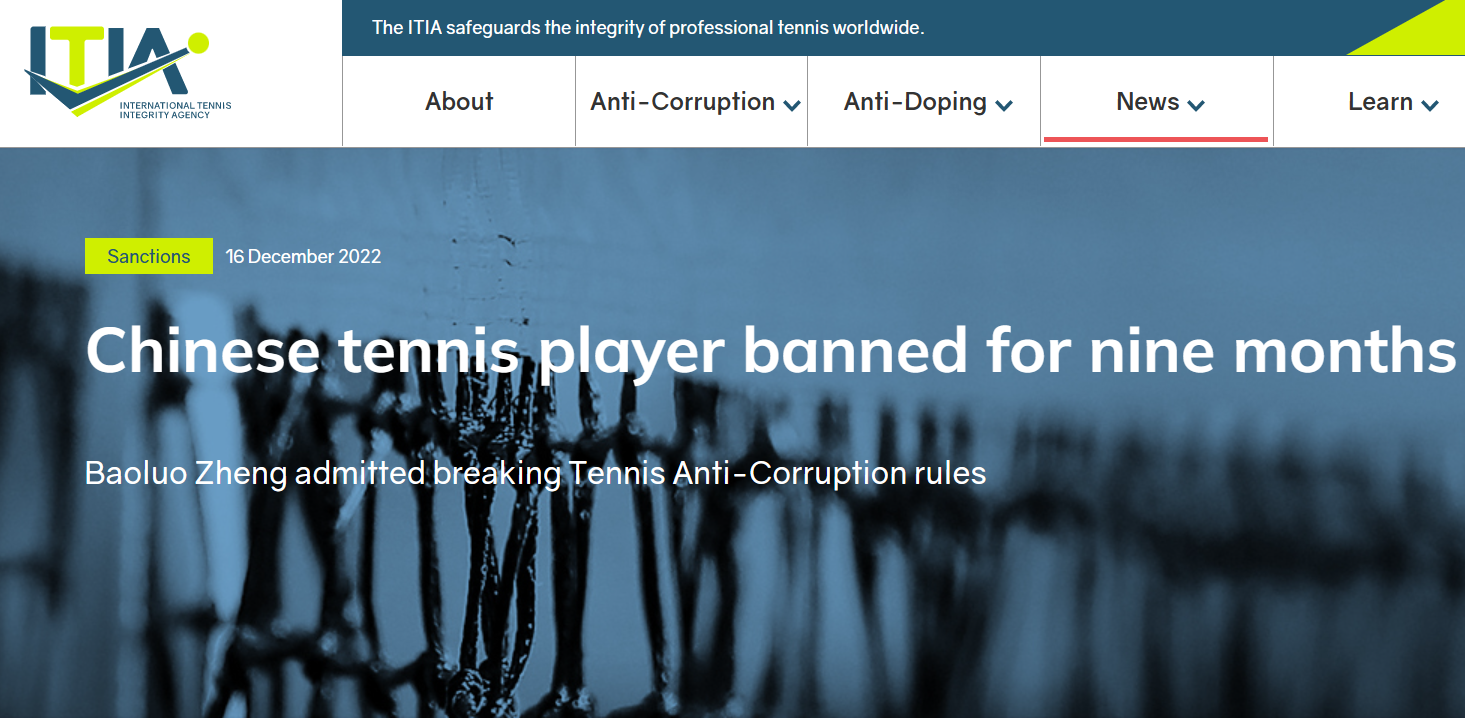 12月16日,国际网球诚信机构(ITIA)在官网发布消息称,中国网球运动员郑宝罗因打假球被禁赛九个月和罚款5000美元。