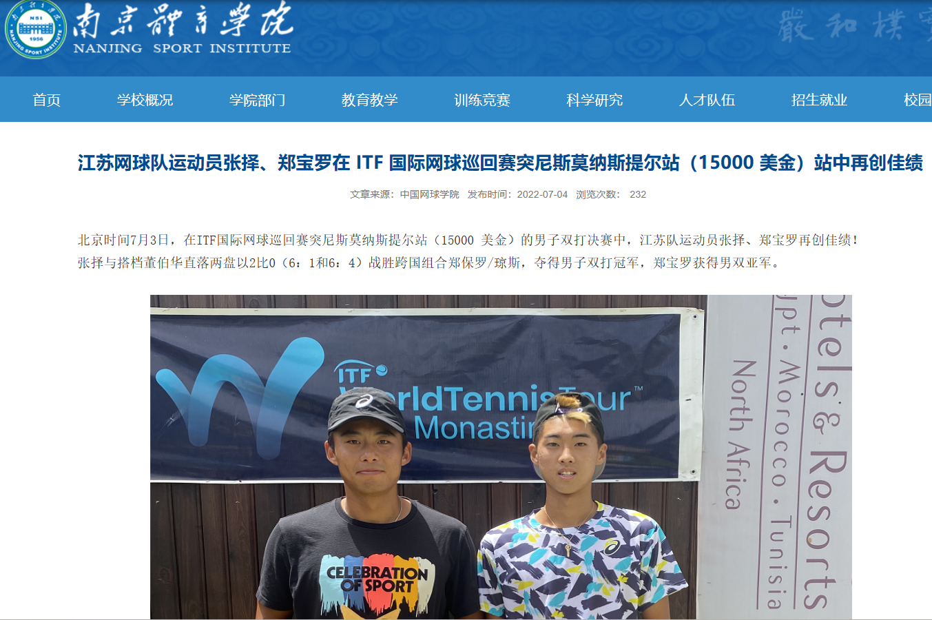 另据南京体育学院官网今年7月4日发布的消息,郑保罗是江苏队运动员,“北京时间7月3日,在ITF国际网球巡回赛突尼斯莫纳斯提尔站(15000 美金)的男子双打决赛中,江苏队运动员张择、郑宝罗再创佳绩!张择与搭档董伯华直落两盘以2比0(6:1和6:4)战胜跨国组合郑保罗/琼斯,夺得男子双打冠军,郑宝罗获得男双亚军。”(来源:网球之家 作者:云卷云舒)