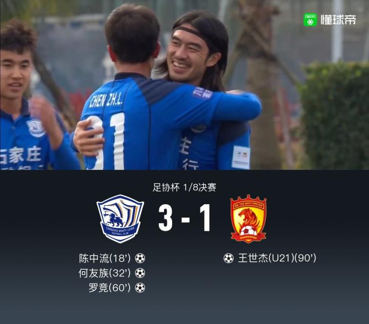 北京时间12月18日16:00,足协杯1/8决赛,沧州对阵广州。本场比赛地点在海口观澜湖足球基地。上半场比赛,陈中流精彩任意球破门,孙健祥贡献精彩扑救,广州队门将霍深坪失误送大礼;下半场,罗竞破门得分锁定胜局,补时王世杰点射扳回一球。最终沧州3-1淘汰广州晋级足协杯八强。