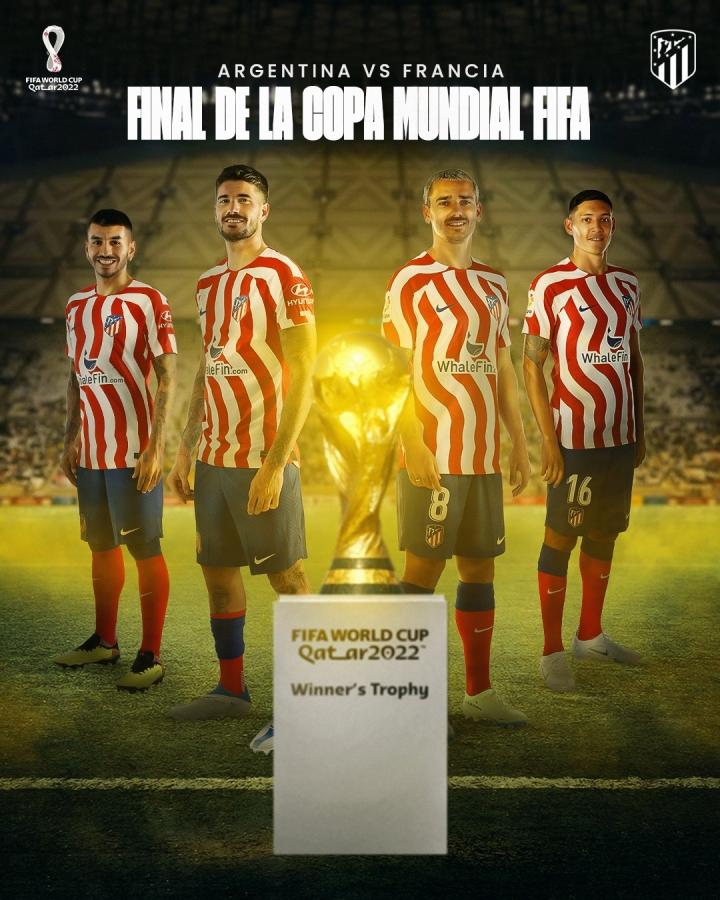 北京时间今晚23点,世界杯决赛,阿根廷将迎战法国队,赛前,作为参加决赛球员最多俱乐部之一的马竞在社交媒体上发布了预热海报。