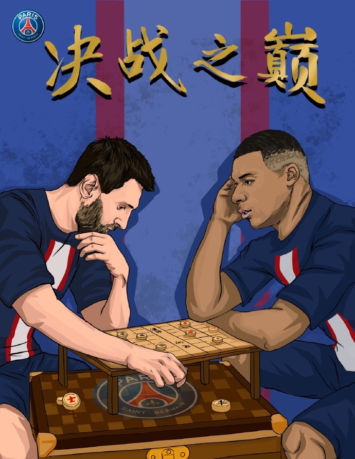 巴黎官方晒出了梅西和姆巴佩在下棋的海报,灵感无疑是来自于此前梅西和C罗下棋的照片。