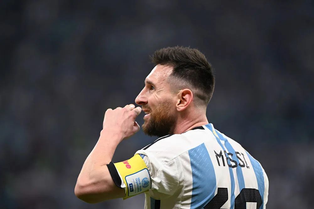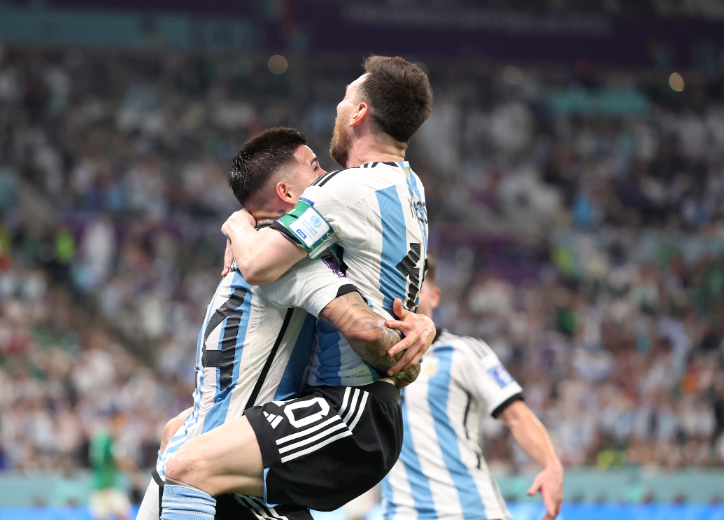 阿根廷2:0墨西哥。11月26日,阿根廷队球员恩佐·费尔南德斯进球后和梅西(右)庆祝。在卢赛尔体育场的这个“巨星之夜”,梅西的一传一射意义非凡:这使他成为唯一连续五届世界杯均有助攻的球员。