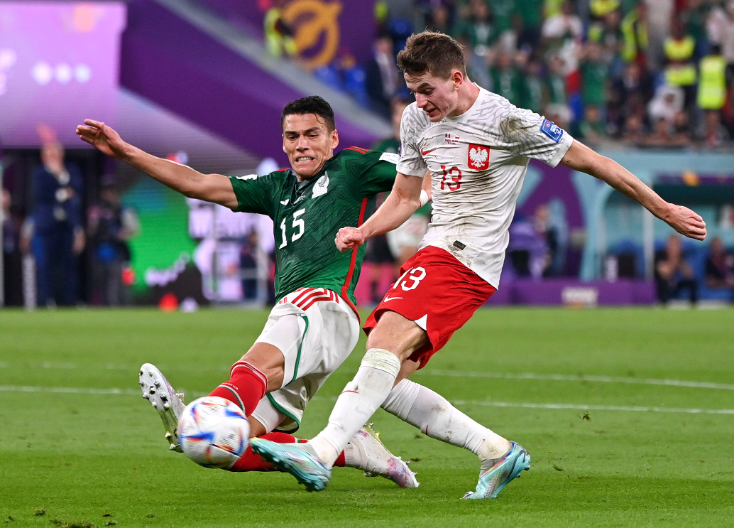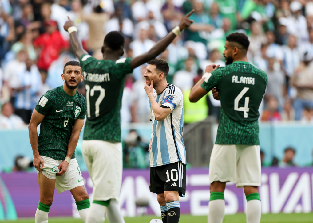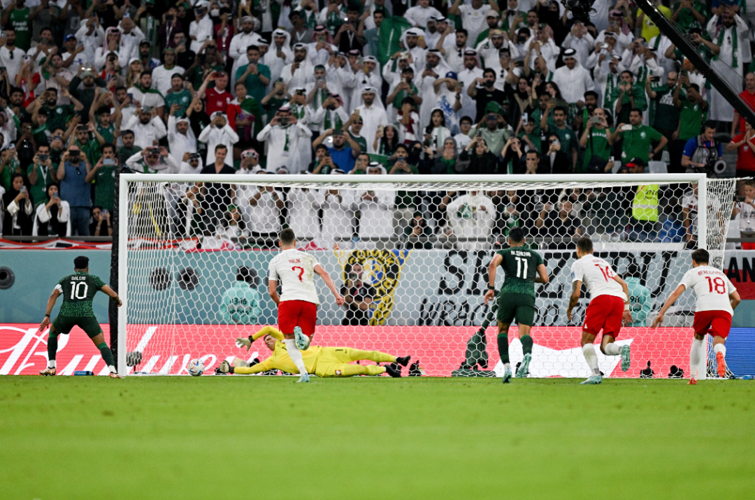 波兰对阵沙特阿拉伯。11月26日,沙特阿拉伯队球员萨勒姆-达瓦萨里(左一)罚点球被波兰队守门员什琴斯尼扑出。