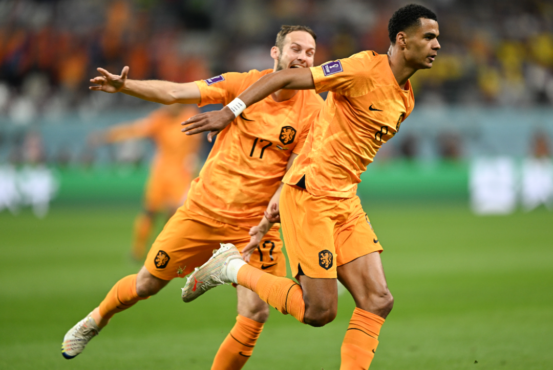 荷兰对阵厄瓜多尔,荷兰队球员科迪·加克波(右)在比赛中进球后庆祝。