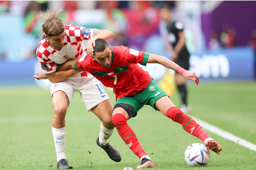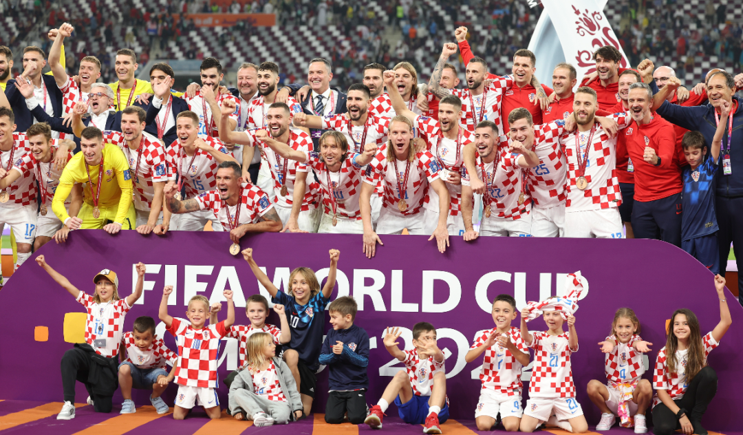 12月17日,克罗地亚队在颁奖仪式上庆祝。当日,在卡塔尔多哈哈里发国际体育场进行的2022卡塔尔世界杯足球赛三、四名决赛中,克罗地亚队以2比1战胜摩洛哥队,获得季军。