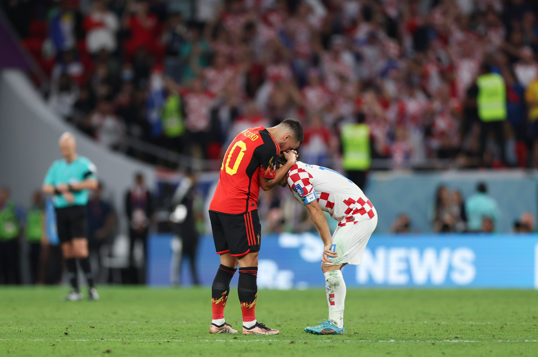 克罗地亚队以0比0战平比利时队。12月1日,比利时队球员阿扎尔(左)与克罗地亚队球员莫德里奇在比赛后。