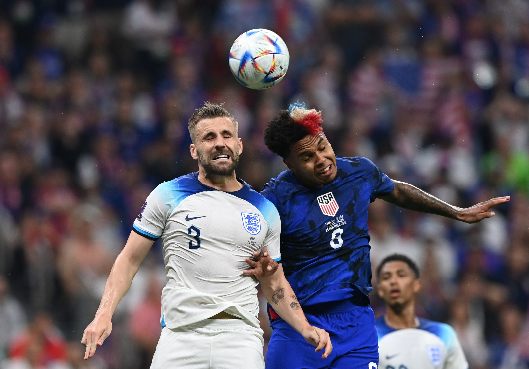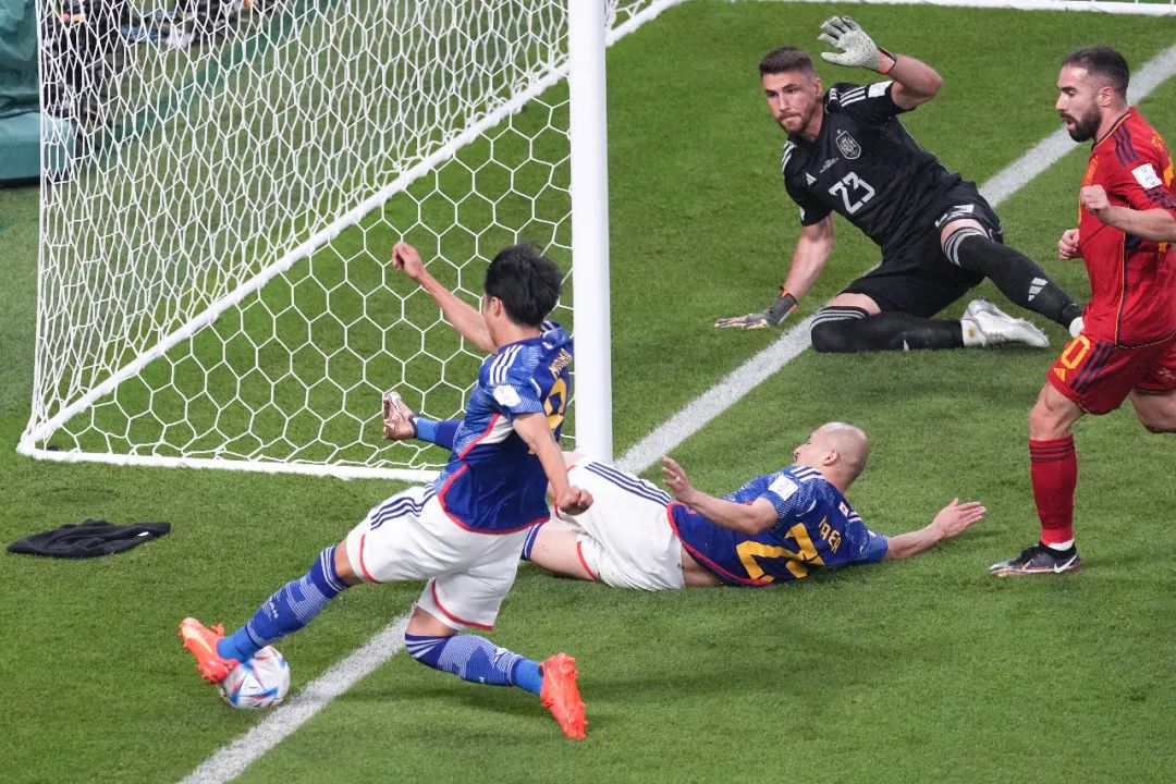日本对阵西班牙。12月1日,日本队球员三笘薰(左一)在比赛中传球,随后队友田中碧破门得分。
