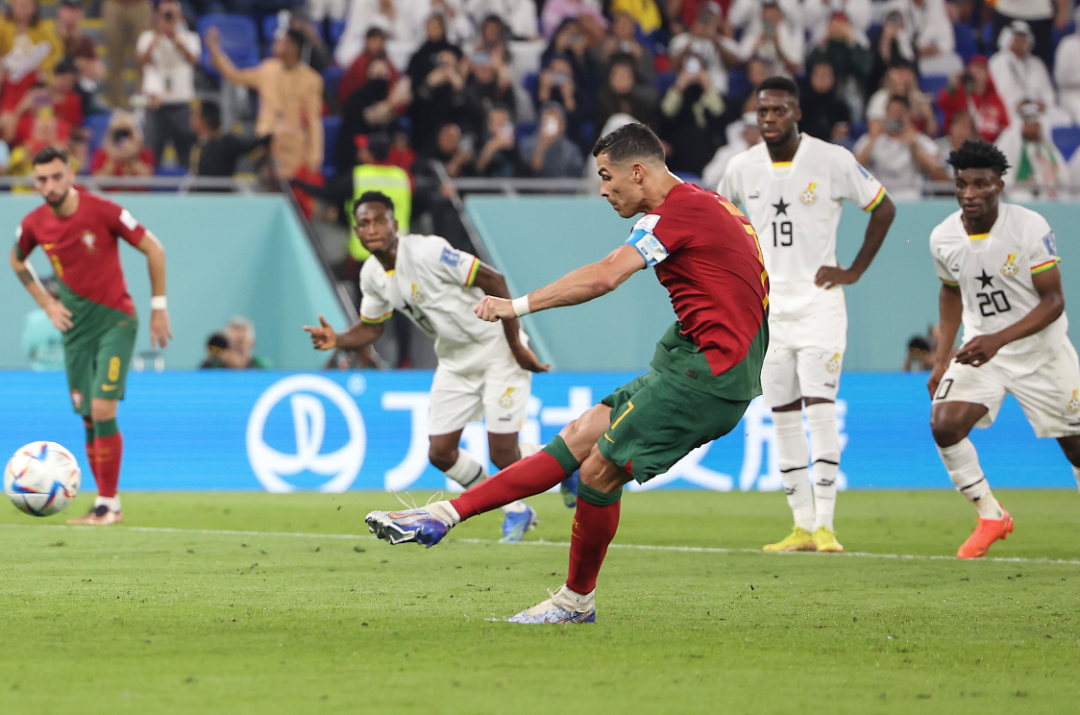 葡萄牙3:2加纳。11月24日,葡萄牙队球员克·罗纳尔多(中)在比赛中主罚点球破门得分。克·罗纳尔多(C罗)领衔的葡萄牙队24日在世界杯小组赛首战3:2险胜加纳队,这位37岁的老将打进一个点球,连续五届世界杯都收获进球,成为历史第一人。