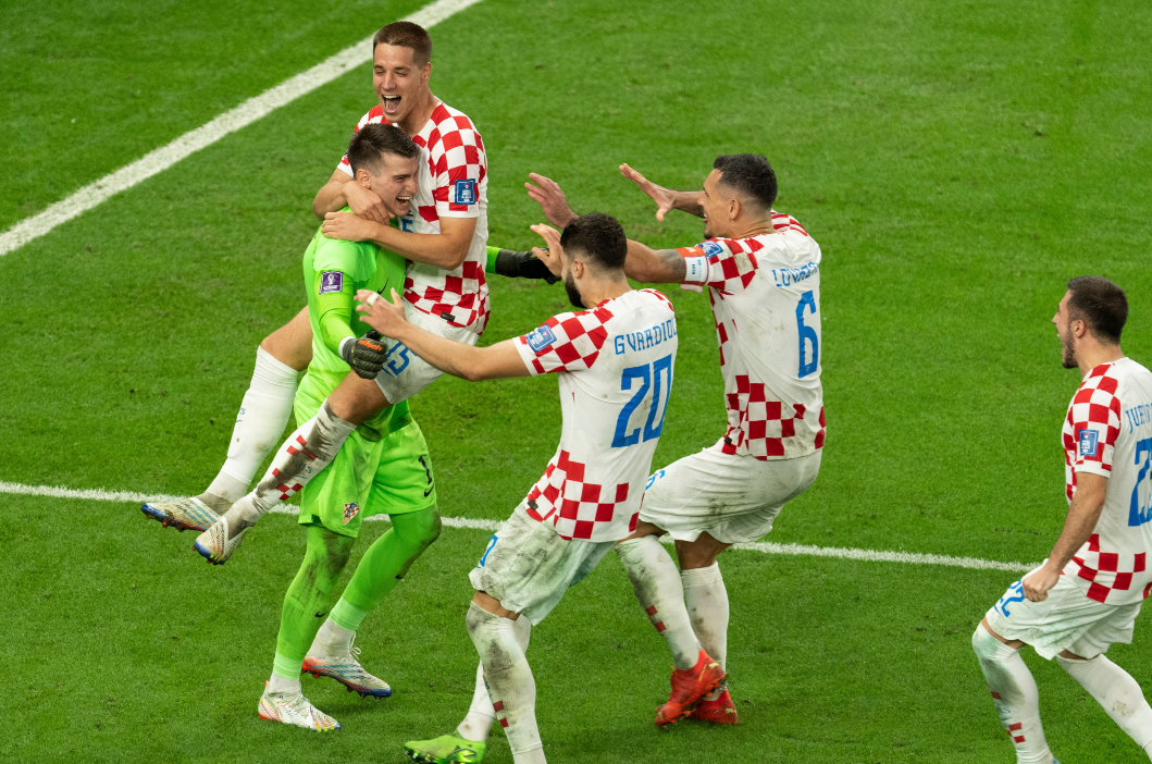 克罗地亚胜日本。12月5日,克罗地亚队球员在比赛后庆祝。点球大战中三次扑救成功,世界杯历史上仅有三人能够做到。利瓦科维奇之前,2006年世界杯葡萄牙队门将里卡多曾三次扑出英格兰队的点球;2018年世界杯,克罗地亚队传奇门将苏巴西奇也曾完成这一壮举。