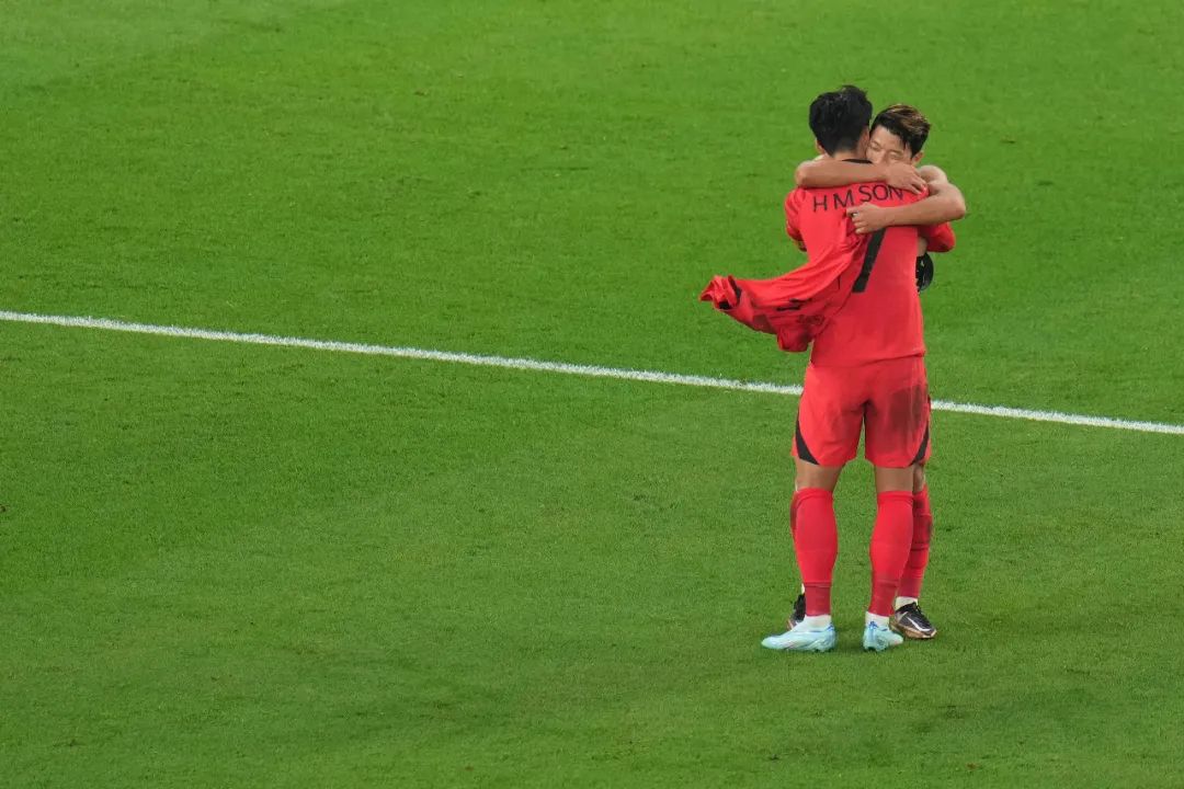 韩国胜葡萄牙。12月2日,韩国队球员黄喜灿(后)在比赛中进球后与队友孙兴民庆祝。当日,在卡塔尔赖扬教育城球场进行的2022卡塔尔世界杯足球赛H组比赛中,韩国队以2比1战胜葡萄牙队。