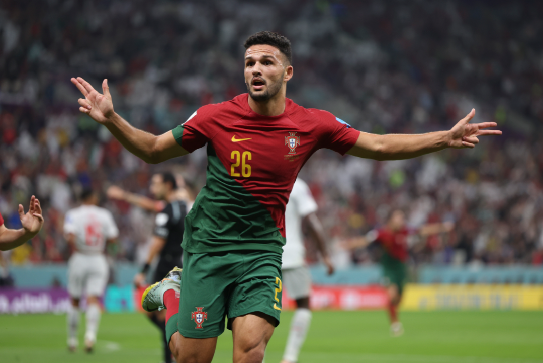 葡萄牙对阵瑞士。12月6日,葡萄牙队球员冈卡洛·拉莫斯在比赛中进球后庆祝。