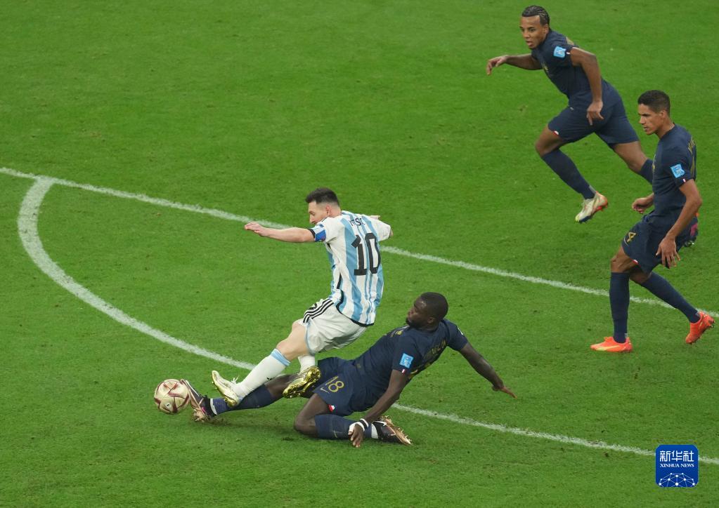 12月18日,阿根廷队球员梅西(左一)在比赛中与法国队球员于帕梅卡诺拼抢。新华社记者 潘昱龙 摄