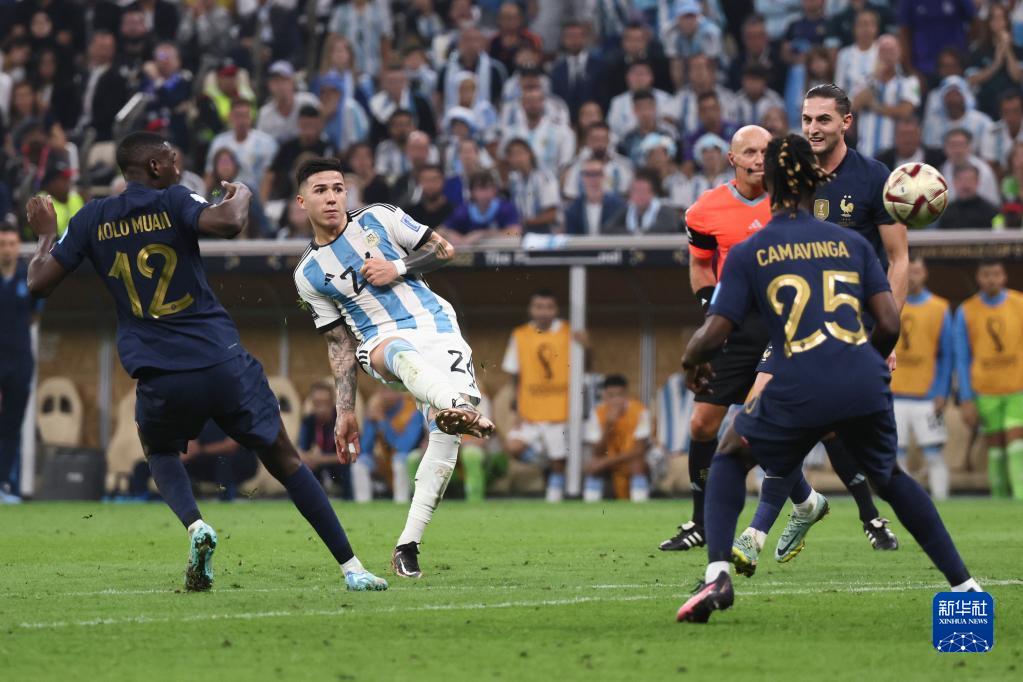 12月18日,阿根廷队球员恩佐·费尔南德斯(左二)在比赛中射门。新华社记者 兰红光 摄
