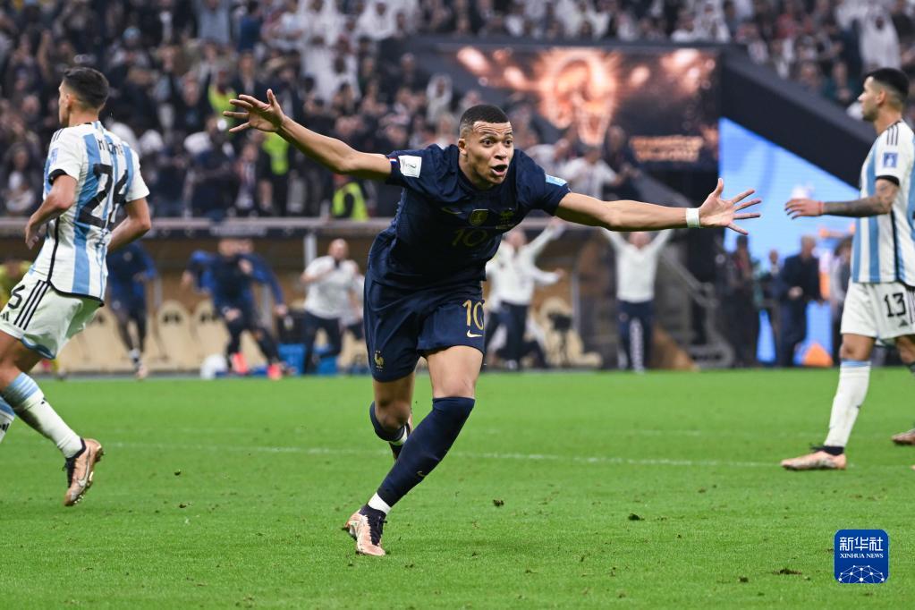 12月18日,法国队球员姆巴佩(中)在比赛中进球后庆祝。新华社记者 李尕 摄