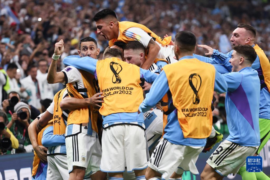 12月18日,阿根廷队球员在加时赛中庆祝队友梅西的进球。新华社记者 兰红光 摄
