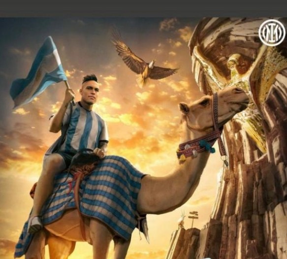 随后,张康阳又晒出劳塔罗的P图,潘帕斯雄鹰展翅高飞,劳塔罗骑着骆驼挥舞着阿根廷旗帜:“世界之巅(世界冠军)!”