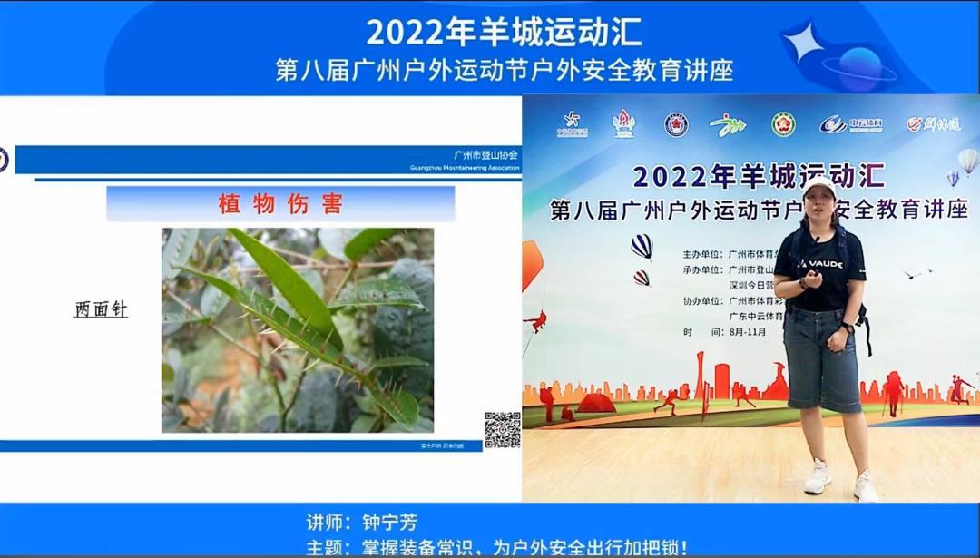 中国体育报讯 日前,户外安全教育讲座第五期于线上顺利开讲。至此,2022年羊城运动汇•第八届广州户外运动节户外安全教育计划系列讲座圆满结束。讲座均以线上直播的方式分期举办,围绕“户外安全”系列主题,邀请业内专家、大咖讲解户外常见的危险以及应急处置方法,帮助户外运动爱好者成为达人玩家,开讲以来受到广大户外运动爱好者的好评,成为大家学习户外风险防控、危机应急处置的行动指南。