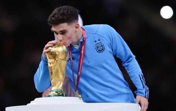 阿尔瓦雷斯在社交媒体发布了两张照片:第一张是他在卡塔尔的球场上举起奖杯的照片,第二张照片是年轻的阿尔瓦雷斯在一家体育商店里拿着奖杯的复制品。他在照片下写道:“这就是足球。我们实现了梦想。2022年世界冠军。我为自己是阿根廷人而自豪。”
