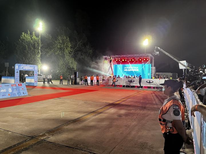 阿根廷的埃塞萨机场已经准备好了迎接世界冠军的到来,他们已经备好了红毯和舞台。