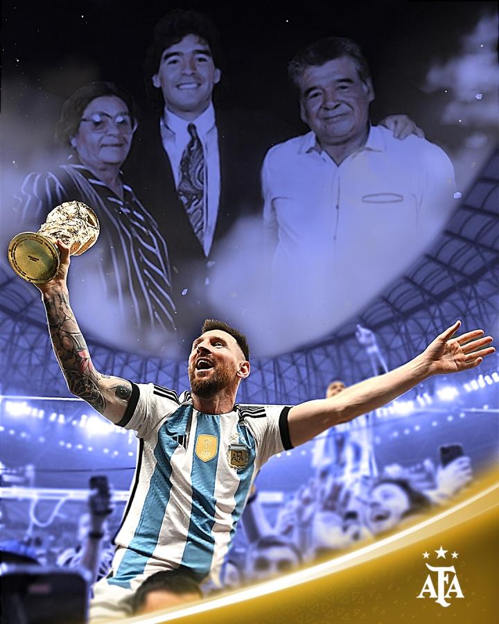 梅西帮助阿根廷时隔36年再度拿到世界杯冠军,阿根廷国家队官方晒出了梅西的夺冠海报,天上的马拉多纳和他的父母正在看着。