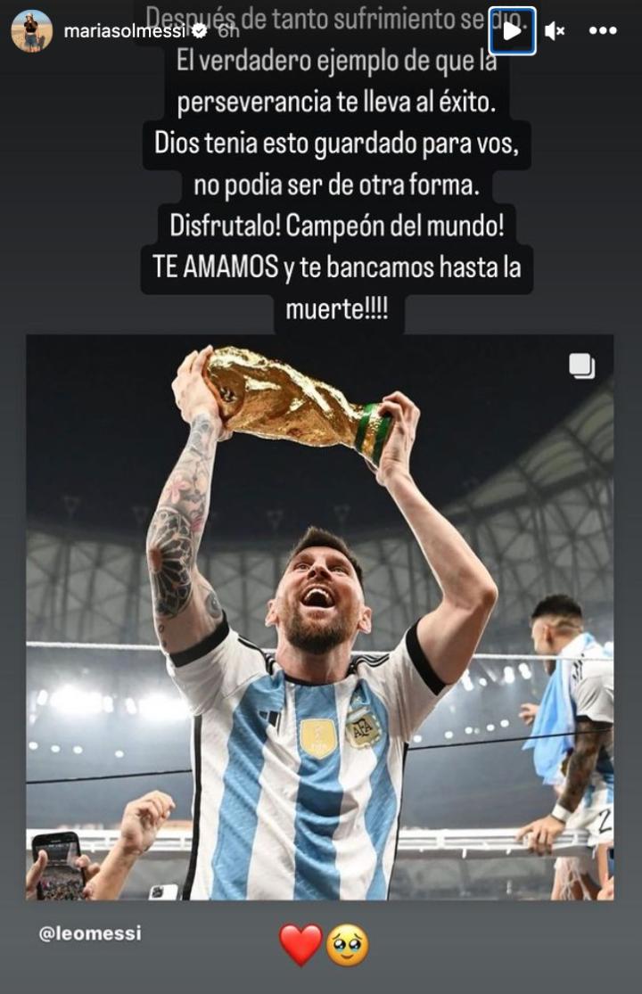 梅西妹妹玛莉亚-索尔写道:“在经历了许多痛苦之后,这一刻它发生了。这就是坚持不懈使你成功的真实例子。上帝已经为你保留了它(世界杯),别无他法。享受奖杯!世界冠军!
