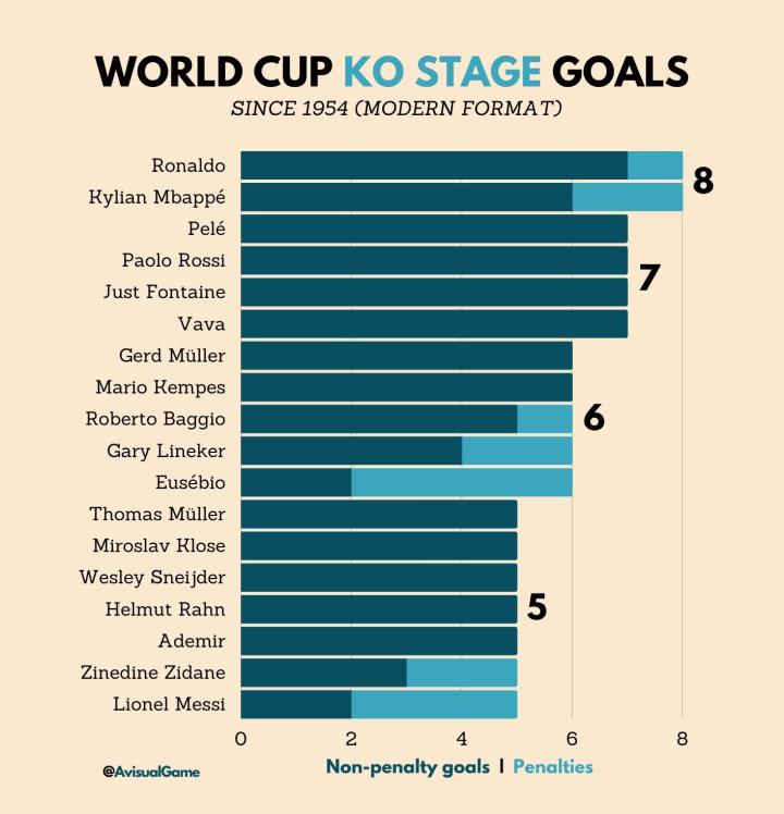 世界杯淘汰赛进球榜上,姆巴佩和罗纳尔多以8球并列第一,梅西5球。