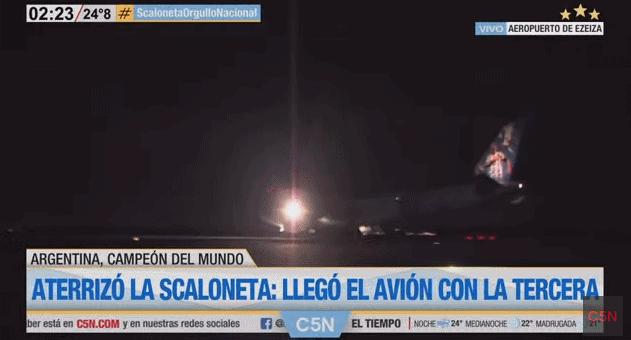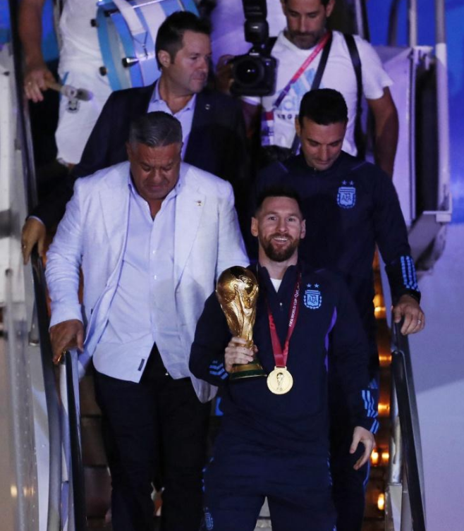 据环球网援引阿根廷体育新闻网站“Tycsports”20日报道,在2022年卡塔尔世界杯夺冠后,当地时间凌晨,阿根廷队乘坐的飞机抵达阿根廷首都布宜诺斯艾利斯。