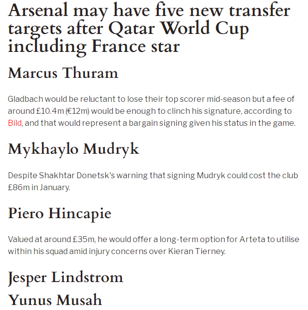 英超联赛的冬季转会窗口期将在1月份打开,在此之前,各支球队的主教练都在忙着引援补强,暂时高居英超联赛榜首的阿森纳也不例外。随着阿森纳的前锋热苏斯、内尔森相继在世界杯舞台受伤归期不定,这让阿森纳引援补强的意愿进一步增强。