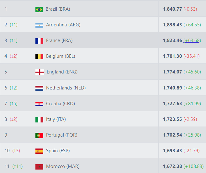 巴西以1840.77分,依旧排名世界第1位。刚刚夺得世界杯冠军的阿根廷,总分为1838.4分,排名上升1位,来到世界第2的位置。亚军法国也上升1位,排名第3位。比利时下降2位,排名第4位。