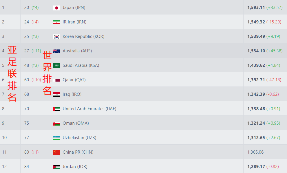 本届世界杯,日本击败德国、西班牙2大豪门,打进16强,这也为他们挣得不少积分。日本从世界第24上升至第20,跃升至亚洲第1;伊朗排名下滑4位,排在第24;韩国排名世界第25,澳大利亚世界第27,沙特世界第48,世界杯东道主卡塔尔排名第60。