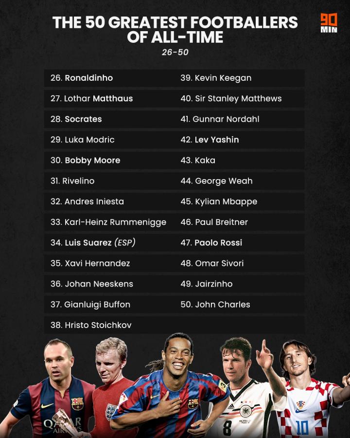 卡塔尔世界杯收官,著名足球媒体90min最新评选出了历史50大球星,梅西第一,马拉多纳、贝利分列二三,现役球员中C罗位列第八,莫德里奇、姆巴佩上榜。