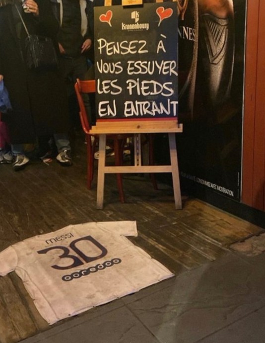 据悉,这家法国酒吧将梅西在巴黎圣日耳曼的30号客场球衣放在入口位置的地板上,同时放置了告知牌并写道:“别忘记擦脚。”