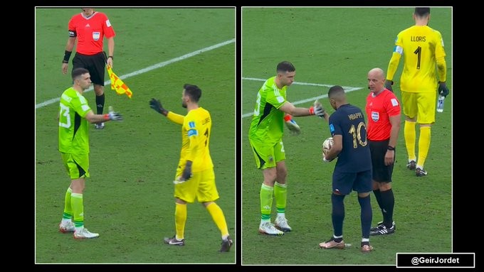 洛里来了之后,马丁内斯友好地与对方握手,第一个罚球队员姆巴佩来了后,马丁内斯也跟他握了手。这就是他的风格,先表现得十分友好,让对方放下戒备,好让法国队对之后的突然发难无所适从,这种前后的反差也是他计谋的一部分。