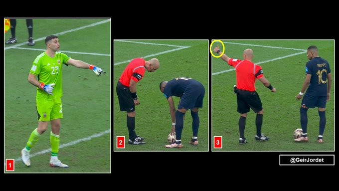 点球大战刚开始的时候,马丁内斯还不敢尝试很过分的干扰行为,他还不清楚裁判的尺度,只能通过一些小的干扰来试探裁判的底线。姆巴佩罚球前,他敦促裁判去检查球的位置,裁判也很友好地听了他的建议,并对他竖起了大拇指。