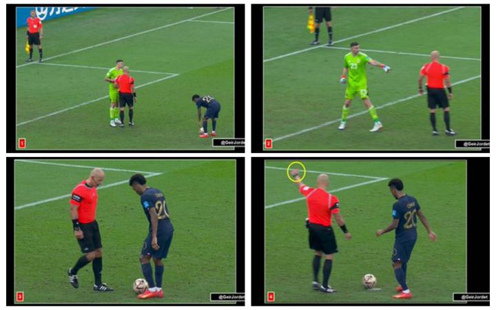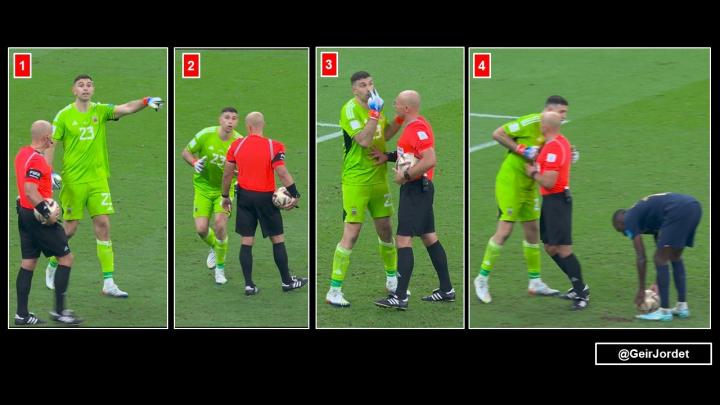 法国的第四名球员穆阿尼罚球前,马丁内斯似乎在与场边的一名工作人员就穆阿尼罚点进行了一番沟通和手势交流,裁判这时终于受不了他的过分行为,给了他一张黄牌,但这时候为时已晚,马丁内斯的计谋基本都得逞了。