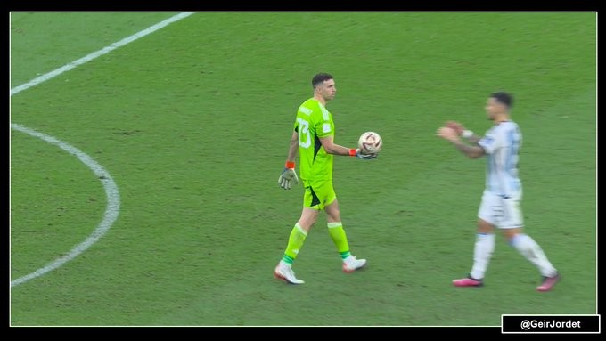到帕雷德斯罚球了,马丁内斯意识到洛里可能会学自己的方法来对付阿根廷球员,于是他迅速拿到球,并把球手递手交到了自己人手里,不给洛里任何可乘之机。