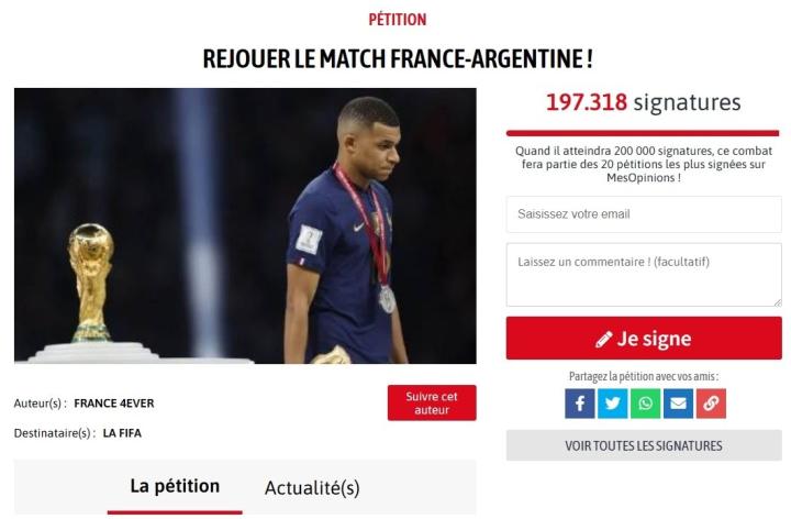 法国对阵阿根廷的重赛请愿书上写道:“判罚完全失败,那不是一粒点球,第二球打入之前他们对姆巴佩犯规了!!!”“集体签名并分享,让比赛重赛!”