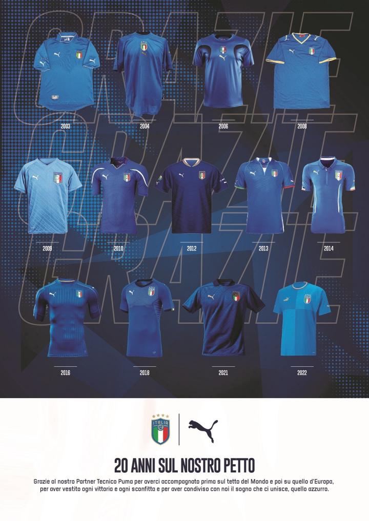 自2002年起,PUMA就成为了意大利国家队的官方球衣赞助商,双方一同留下了许多美好的回忆,包括2006年的世界杯夺冠,以及在2021年夺得欧洲杯冠军,PUMA也是迄今为止与意大利队合作时间最长的球衣赞助商。