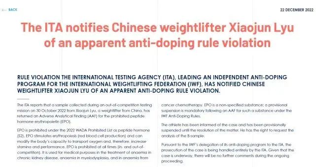 12月22日,国际兴奋剂检测机构(ITA)在官方网站发布公告:三届奥运会举重冠军得主吕小军暂时被禁赛,理由是在10月的一次赛外兴奋剂检测结果呈阳性。